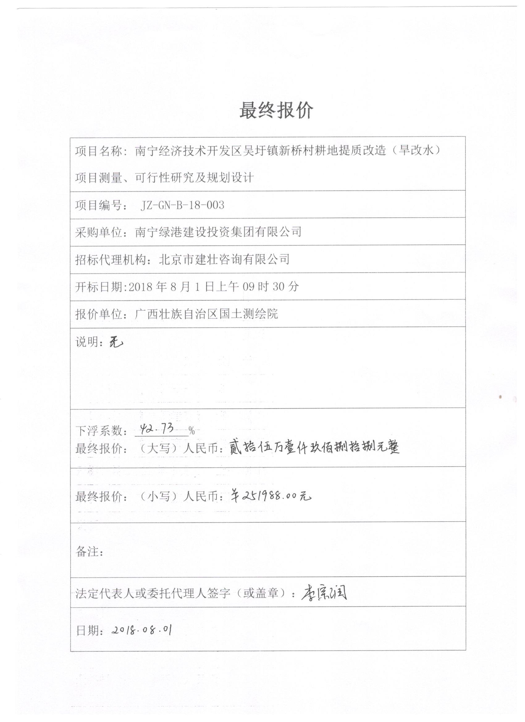 北京市建壮咨询有限公司受凯时优质运营商委托,凭证《中华人民共和国政府采购法》等有关划定,于2018年8月1日就南宁经济手艺开发区吴圩镇新桥村耕地提质刷新(旱改水)项目丈量、可行性研究及妄想设计以竞争性探讨方法举行采购,现就本次采购的成交效果通告如下: